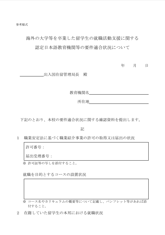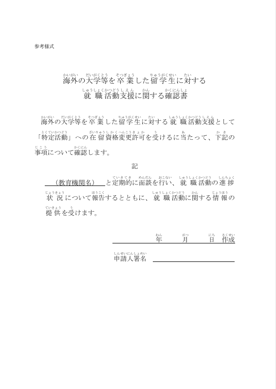- 直前まで在籍していた日本語教育機関と定期的に面談を行うとともに、就職活動に関する情報提供を受ける旨の確認書 1通