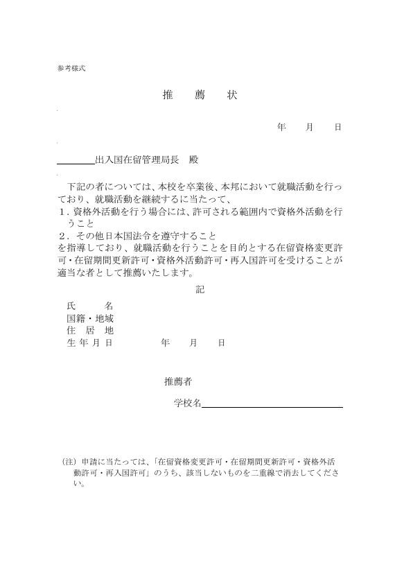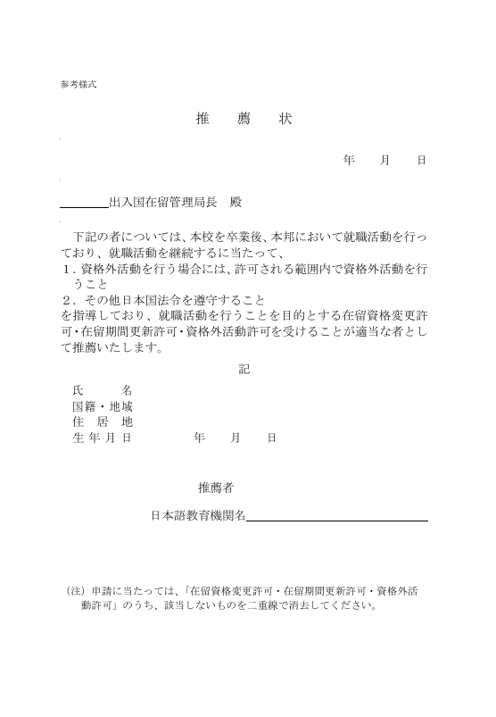 8.直前まで在籍していた日本語教育機関による継続就職活動についての推薦状 1通