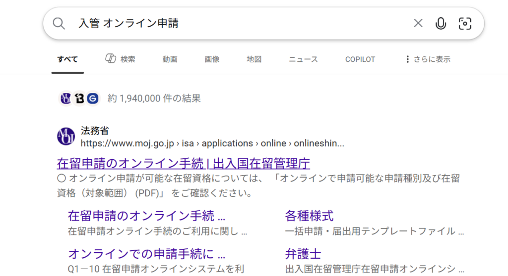 まずは、「入管 オンライン申請」などの検索ワードを検索窓に入力します。