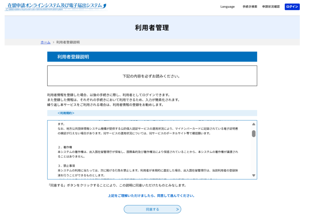 「オンライン申請手続き」→「利用申出(新たに在留諸申請の実施を希望する所属機関の方)」と進み、利用規約を読みます。、「同意する」ボタンを押すと利用者情報を入力する画面に移ります。