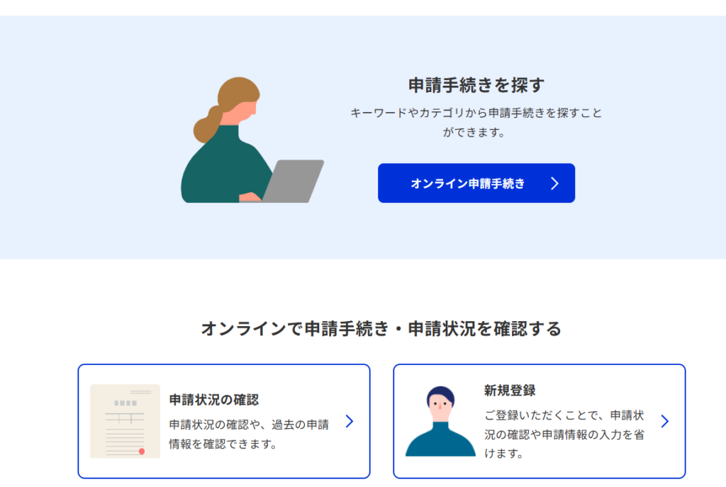 以下は、オンラインで手続きを行う際の手順です。郵送、窓口でも手続きを行うことができます。