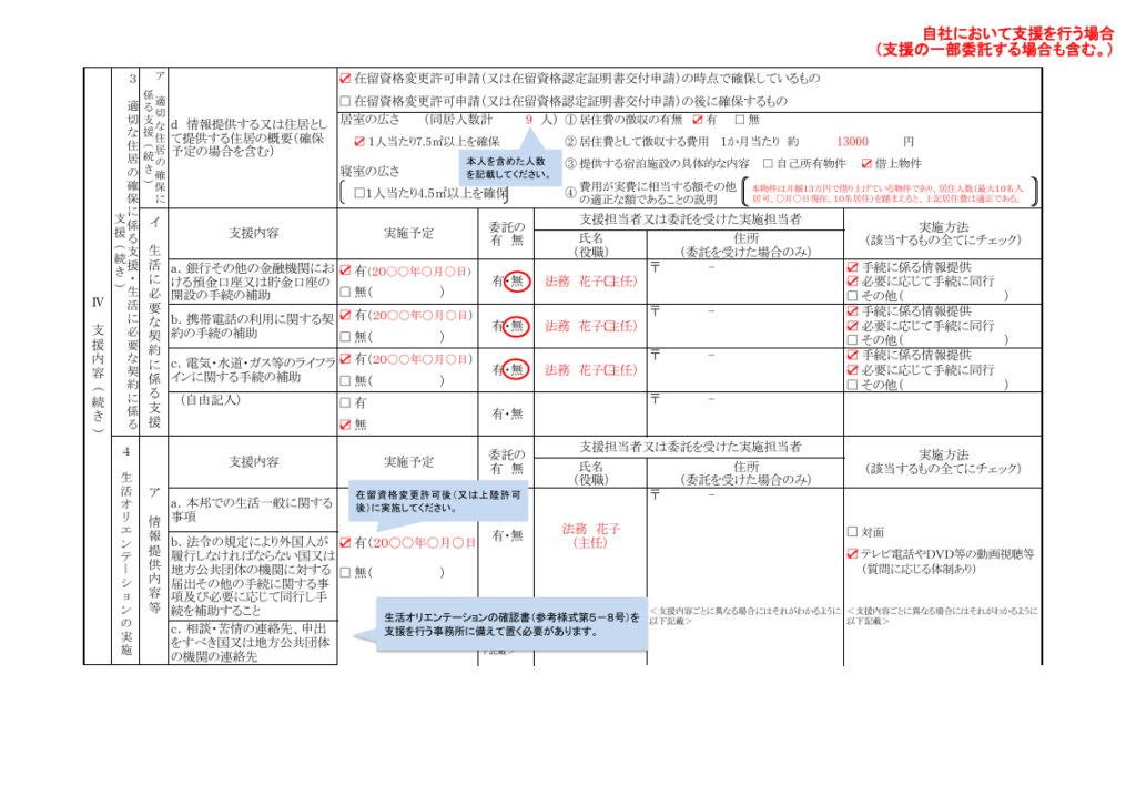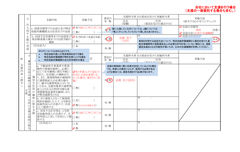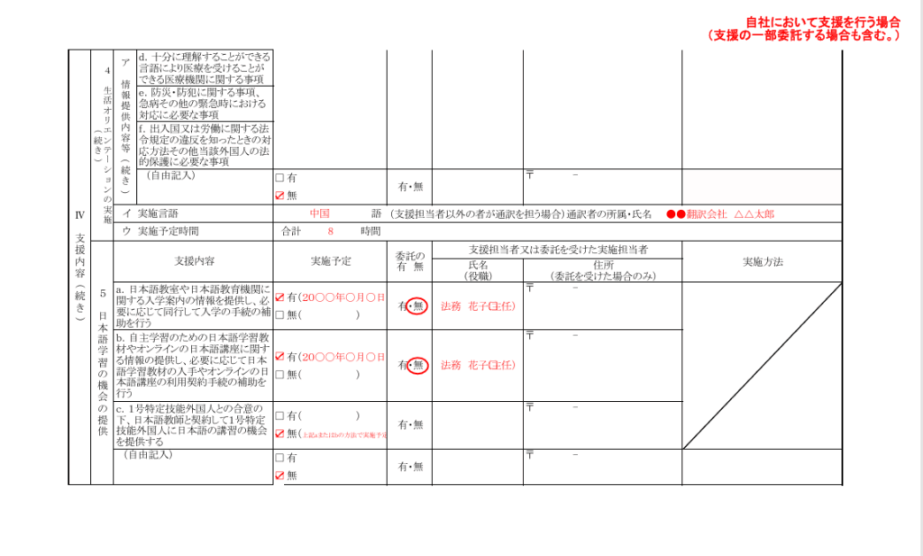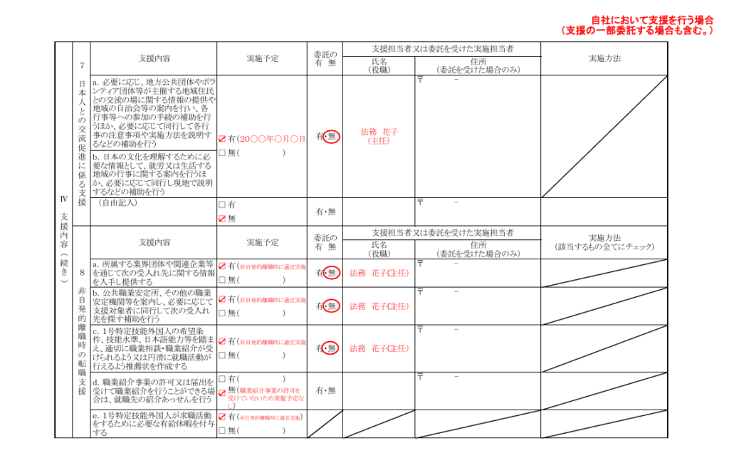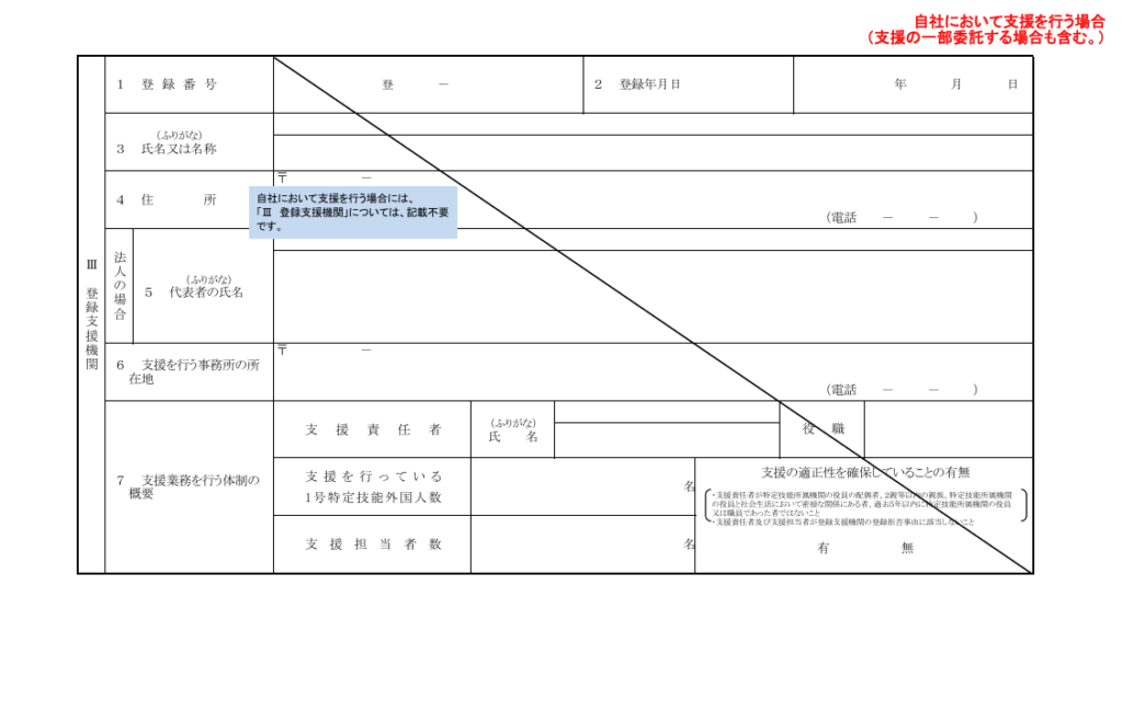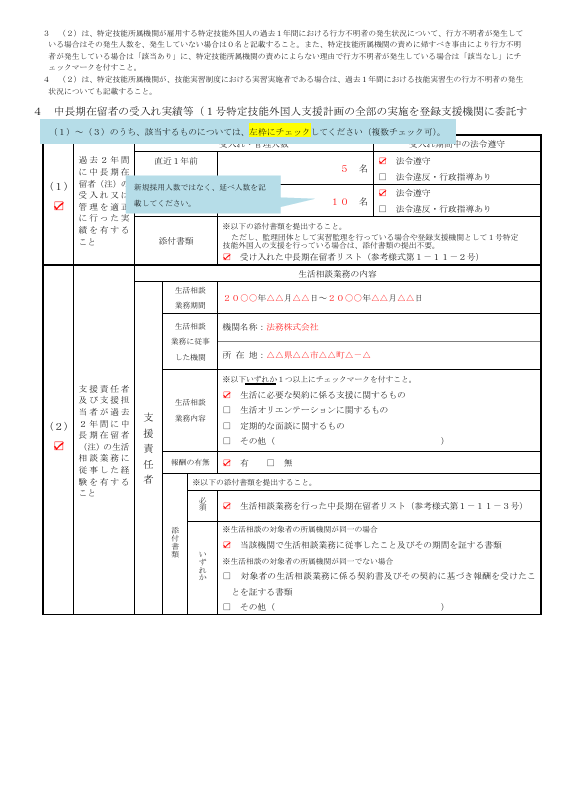 登録支援機関に外国人支援計画の全部を委託する場合は、4の「中長期在留者の受入れ実績等」の欄の記載は不要ですが、今回は自社支援に変更しますので、4の欄の記載をする必要があります。