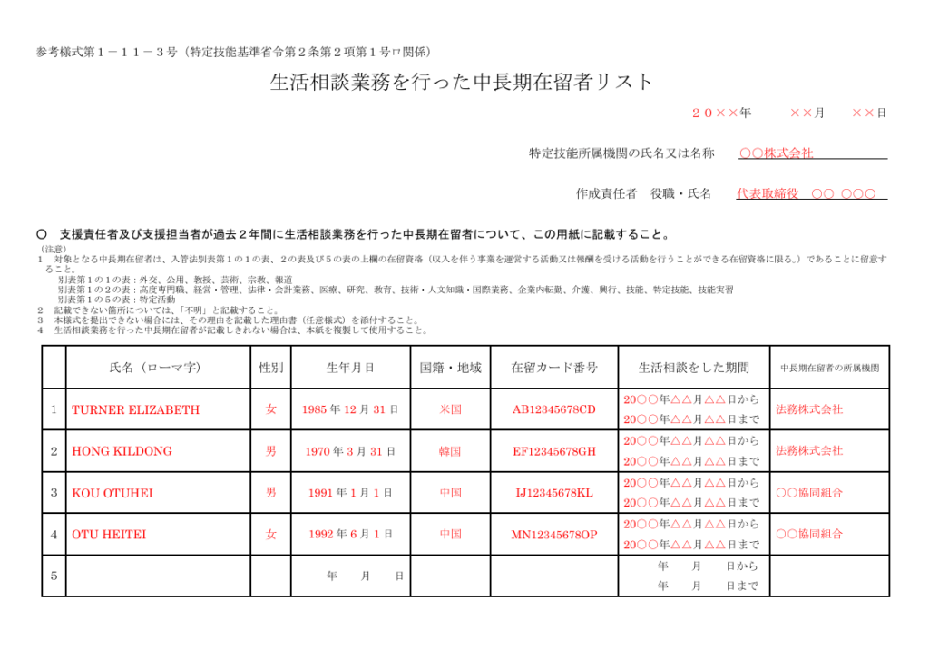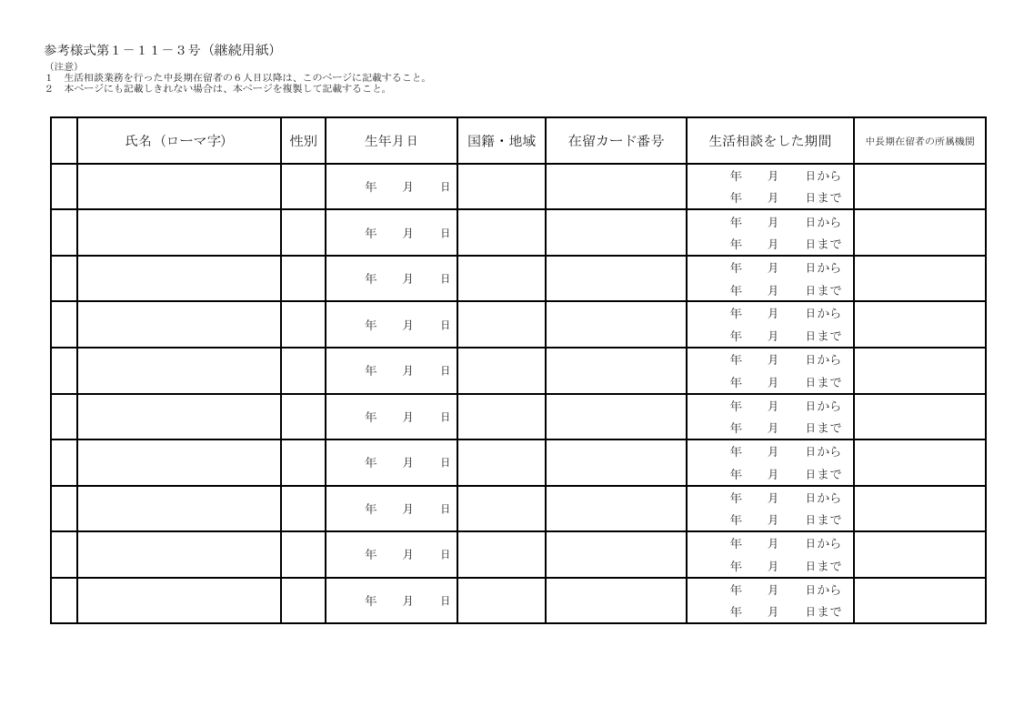 生活相談業務を行った中長期在留者リスト(参考様式1-11-3)