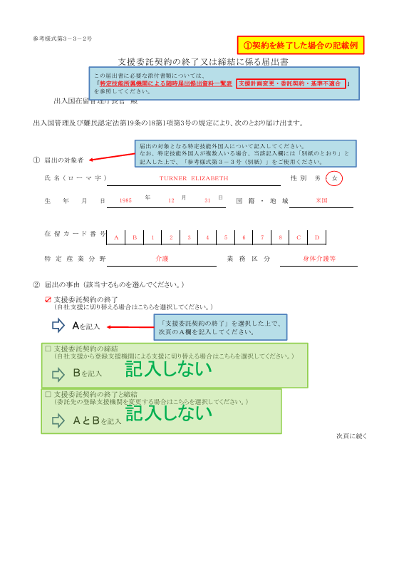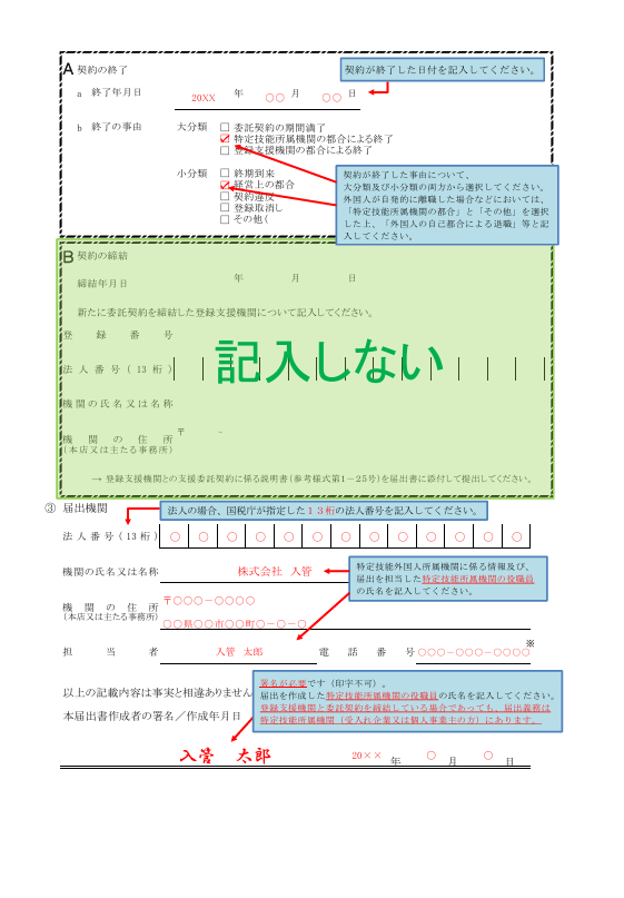 登録支援機関との支援委託契約の終了と締結が同じ様式になっていますので、少々ややこしいですが、今回は「終了」しますので、「A欄」のみを記載していきます。