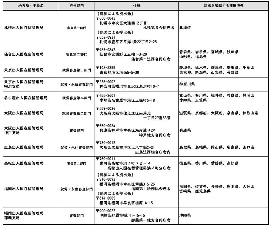 提出先となる特定技能所属機関の住所(法人の場合は、登記上の本店所在地)を管轄する地方出入国在留管理局・支局は以下のとおりです。