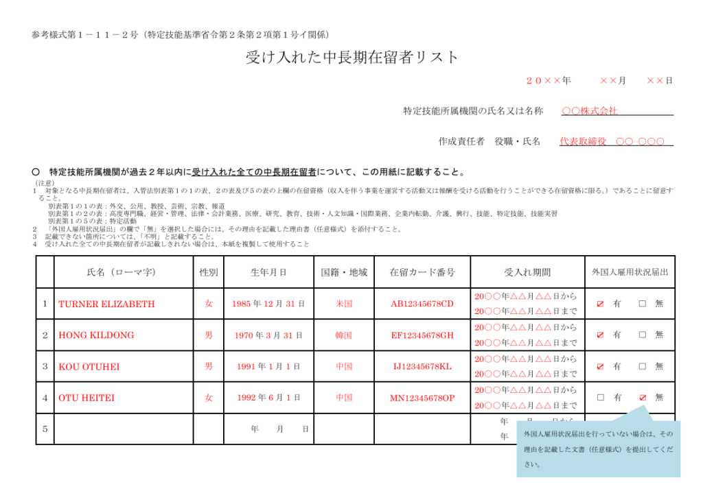 受け入れた中長期在留者リスト(参考様式1-131-2)