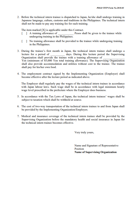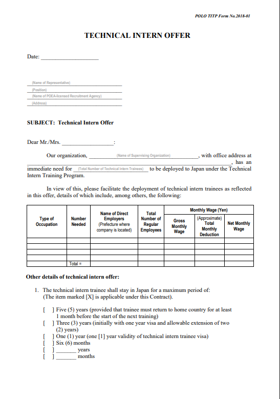 認定送出し機関(PRA)の代表者宛てに、どのような条件で、何人のフィリピン人を送り出して欲しいのかを記載する書類です。