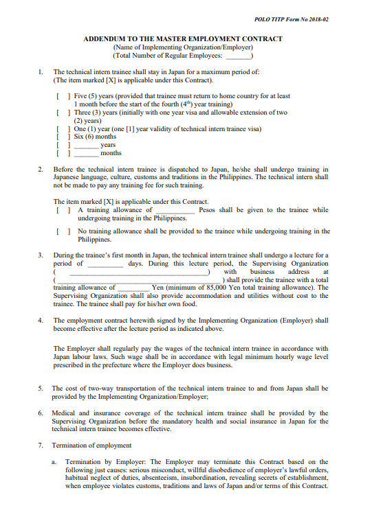 - Addendum to the Master Employment Contract(雇用契約書の補遺文書)