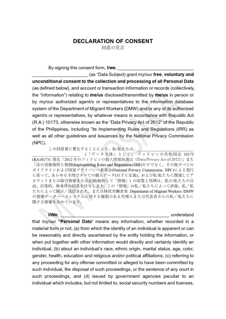 以下がDeclaration of Consent(同意の宣言)です。実習実施者、監理団体、送出し機関それぞれで用意する必要があります。Declaration of Consent(同意の宣言)はMWO大阪のホームページにはフォーマットが無いため、送出し機関に作成してもらうことが多いものになります。