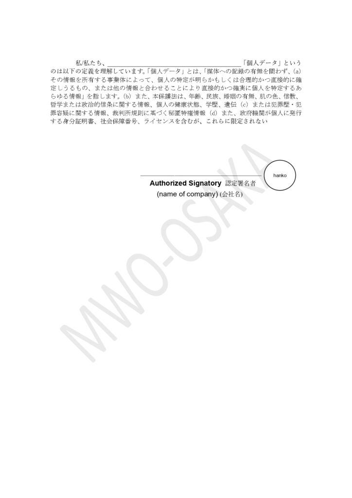 下線部分に機関名(会社名)を入れ、全てのページに代表者の直筆の署名と会社印を押印してください。