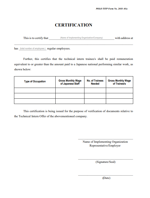 「Certification(証明書)」とは、従業員の人数を、実習実施機関(雇用者)が証明するための書類です。この人数は、MWO大阪に問い合わせたところ、追加申請時の人数ではなく、初期登録(Initial Accreditation)時の人数で良いということでした。