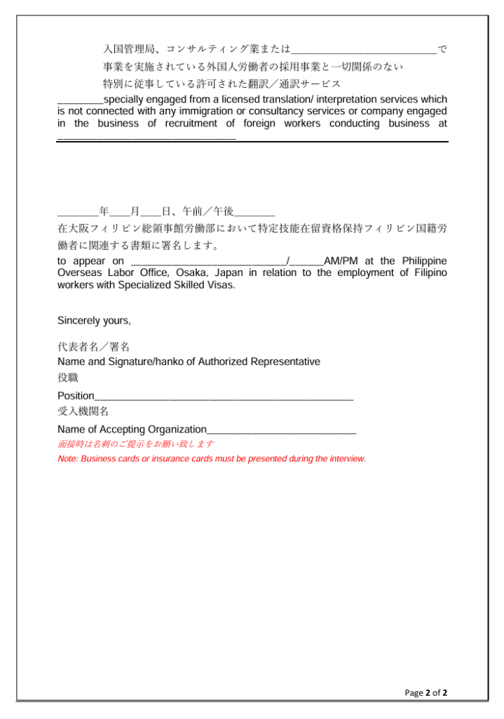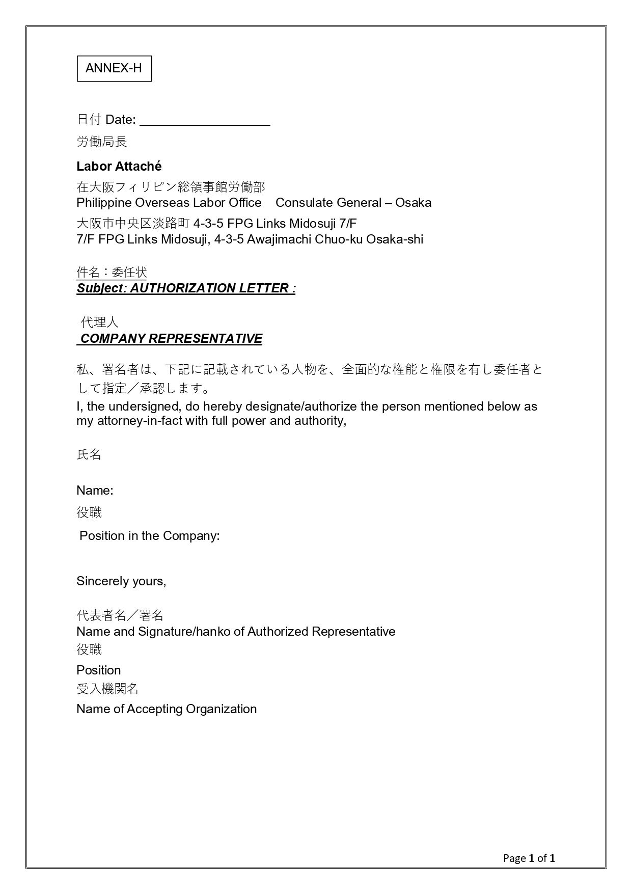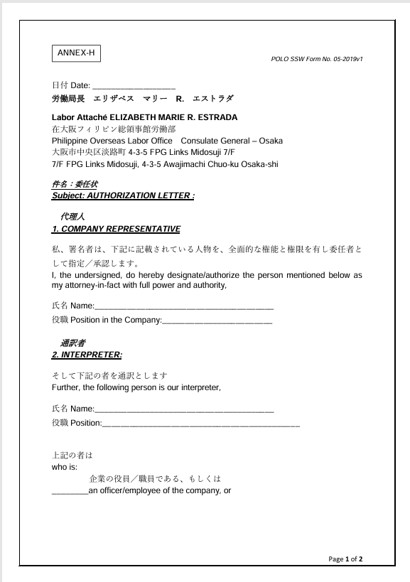 Specified Skilled Worker(特定技能)のDownloadable Forms、「Annex-H」(Authorization Letter)を使用します。