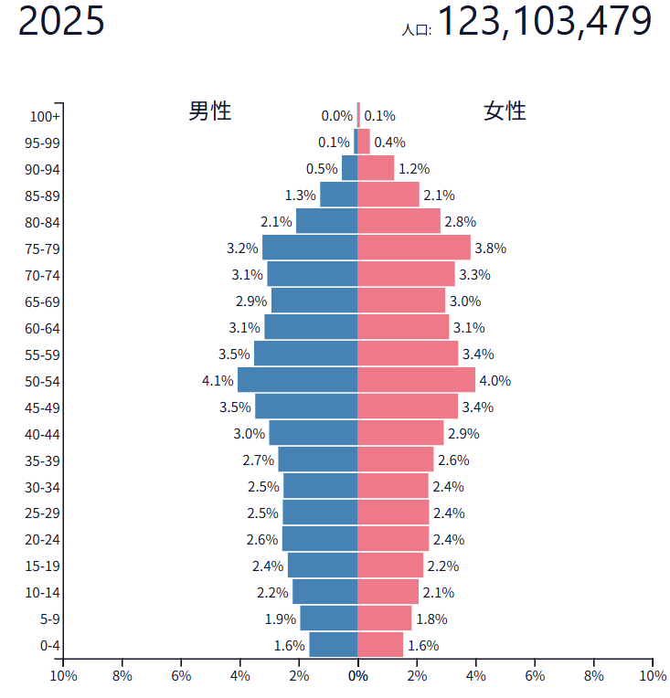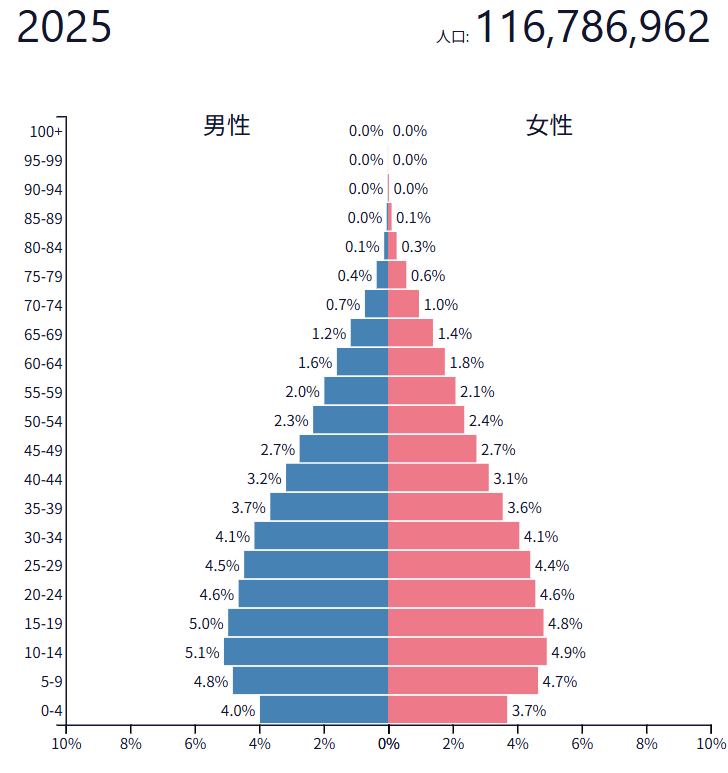 以下は日本の人口ピラミッドと、フィリピンの人口ピラミッドを並べたものです。