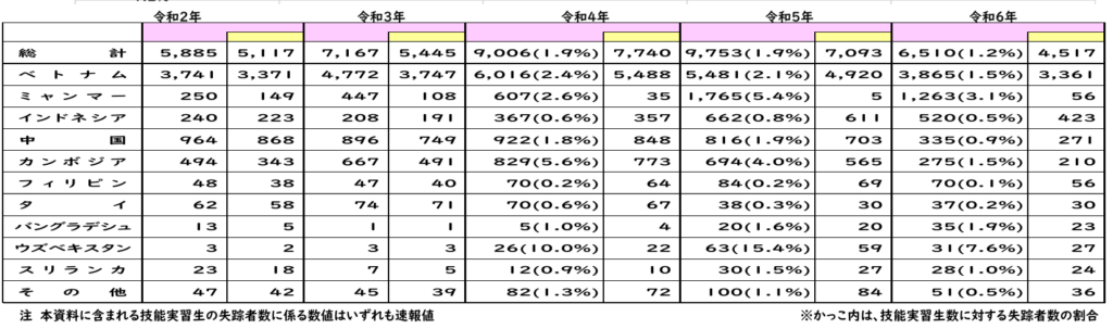 出入国在留管理庁発行の「技能実習生の失踪者数の推移」によると、令和4年度から令和6年度の失踪率は、フィリピンが断トツで低いことが分かります。